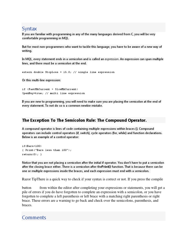 Similar to comments in other languages, MQL4 comments are sometimes used in code to explain parts of