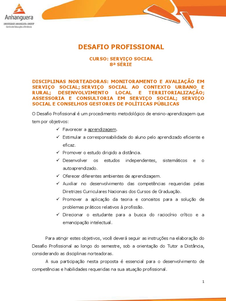 Desafio Profissional ao longo do semestre, sob a orientao do Tutor a Distncia,