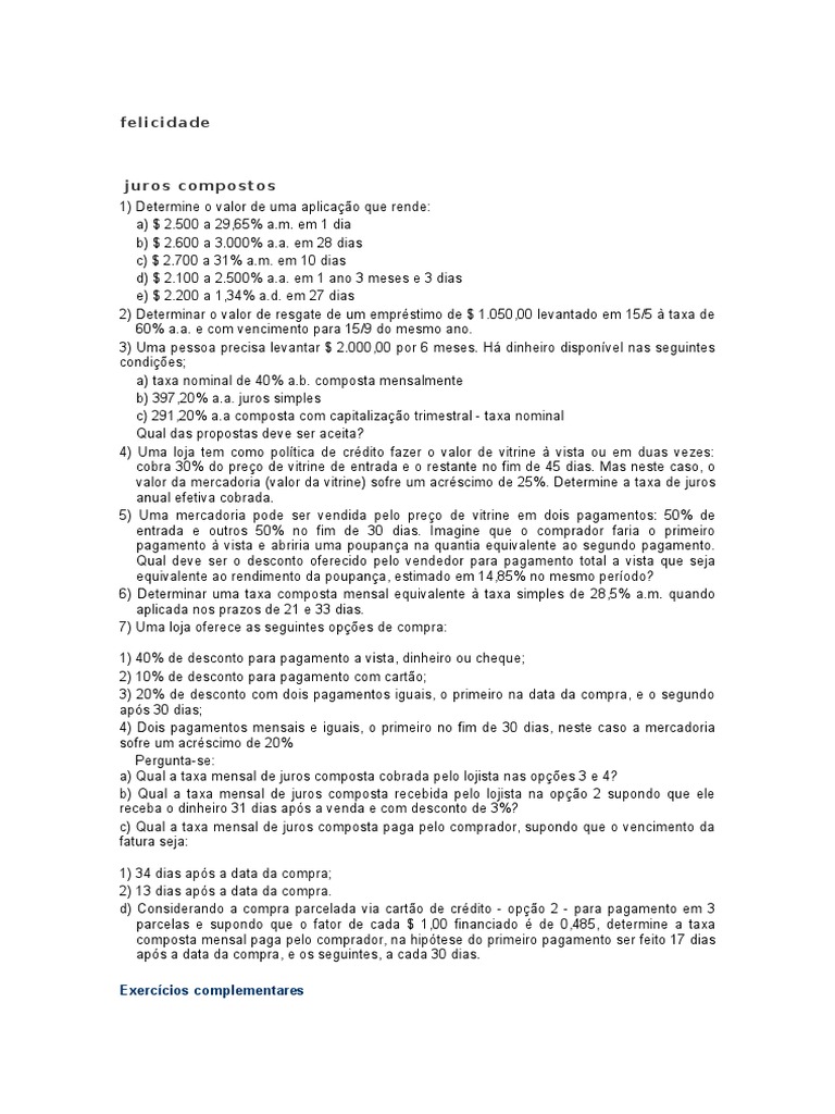 1) Determine o valor de uma aplicao que rende: