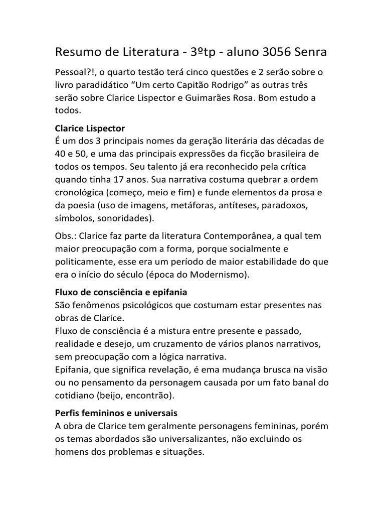 Obs.: Clarice faz parte da literatura Contempornea, a qual tem
