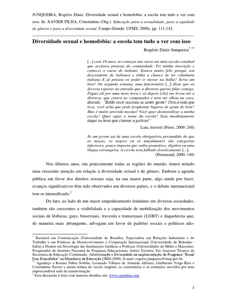* Bacharel em Comunicação (Universidade de Brasília), Especialista em Relações Industriais e do Trabalho e em Políticas de Desenvolvimento e Cooperação Internacional (Universidade de Bolonha - Itália) e Doutor em Sociologia das Instituições Jurídicas e Políticas (Universidades de Milão e Macerata). Pesquisador do Instituto Nacional de Pesquisas Educacionais Anísio Teixeira. Foi Assessor Técnico da Secretaria de Educação Continuada, Alfabetização e Diversidade na implementação do Programa “Brasil Sem Homofobia” no Ministério da Educação (2004-2008). E-mail: rogerio.junqueira@inep.gov.br. ** Agradeço a Rosana Núbia Sorbile, Leonardo Villares de Almeida Affonso, Guilherme Veiga Rios e Constantina Xavier a atenta leitura da versão original, os comentários e os estímulos movidos por uma imprescindível sede de transformação. 1 Essa discussão é feita com maiores detalhes em: www.sxpolitics.org.