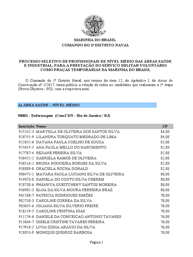 Convocao n 1/2017, torna pblico a relao de todos os candidatos que realizaram a 1 etapa
