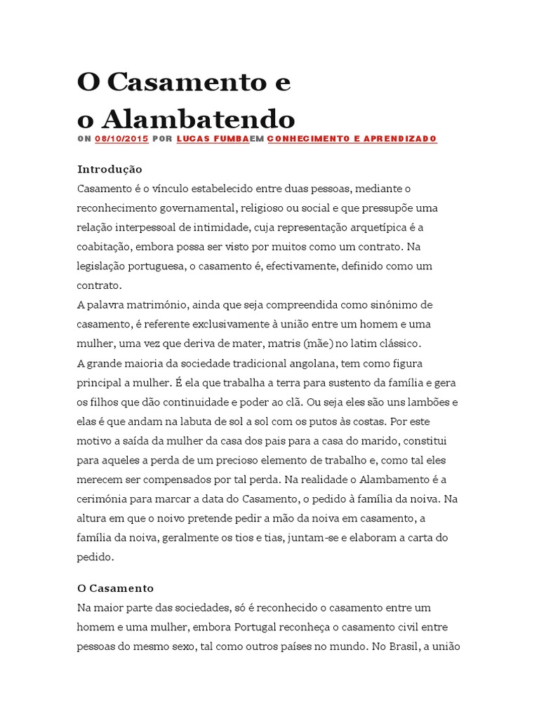 Casamento o vnculo estabelecido entre duas pessoas, mediante o