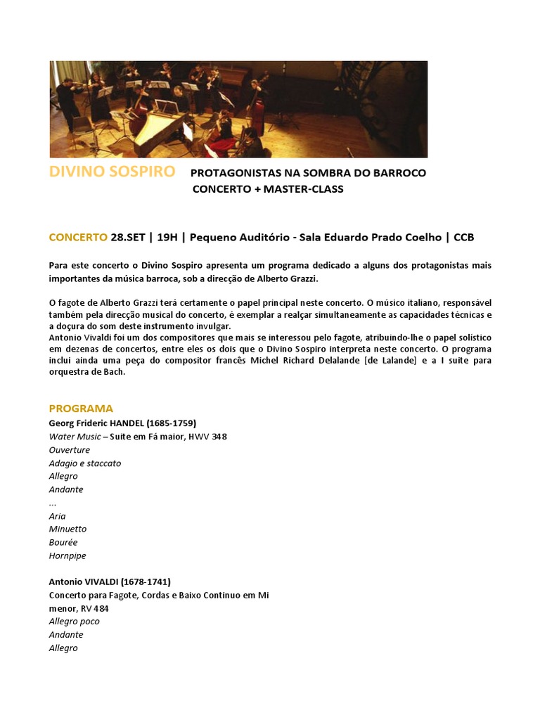 O Divino Sospiro e o Centro Cultural de Belém organizam uma master-class de fagote barroco e música de câmara dirigida por Alberto Grazzi que decorrerá nos dias 22, 23 e 24 de Julho de 2008.