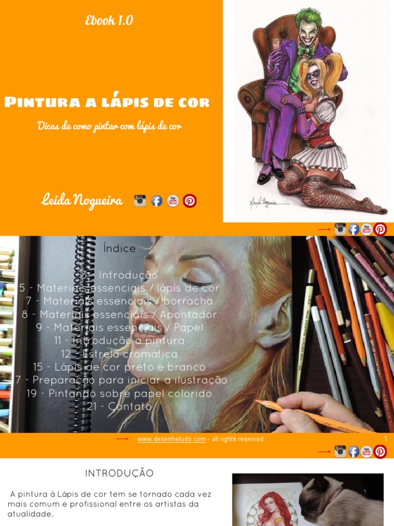 3 - Introdução 5 - Materiais essenciais / lápis de cor 7 - Materiais essenciais / borracha 8 - Materiais essenciais / Apontador 9 - Materiais essenciais / Papel 11 - Introdução a pintura 12 - Estrela cromática 15 - Lápis de cor preto e branco 17 - Preparação para iniciar a ilustração 19 - Pintando sobre papel colorido 21 - Contato