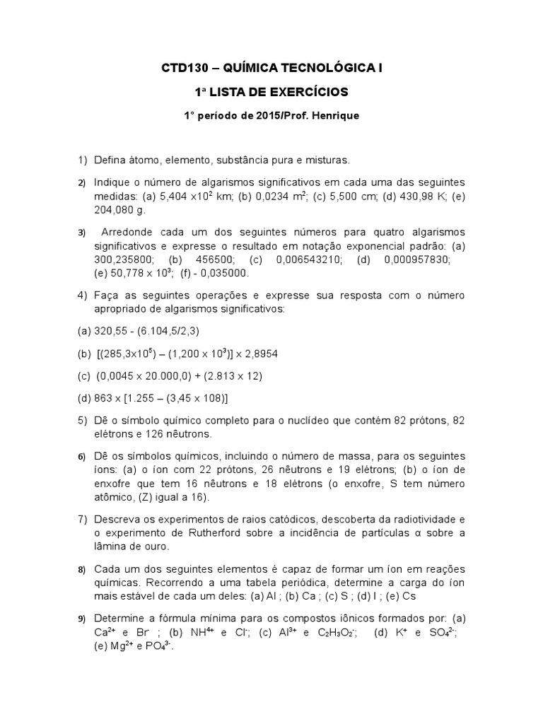 1) Defina tomo, elemento, substncia pura e misturas.