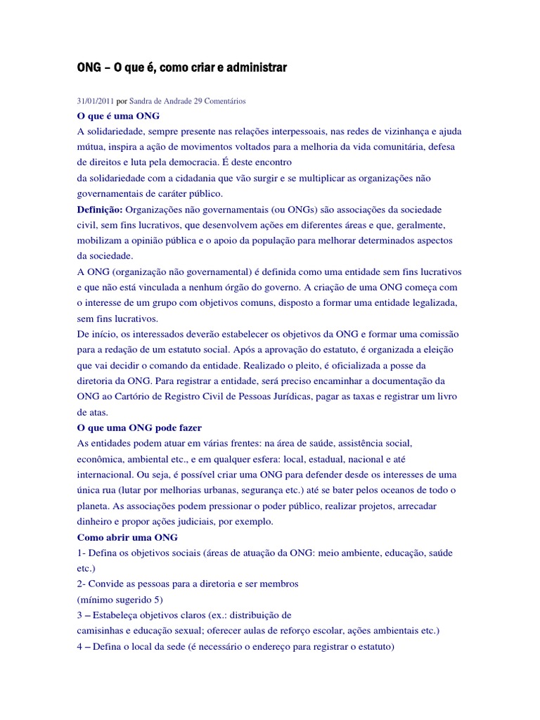 e que no est vinculada a nenhum rgo do governo. A criao de uma ONG comea com