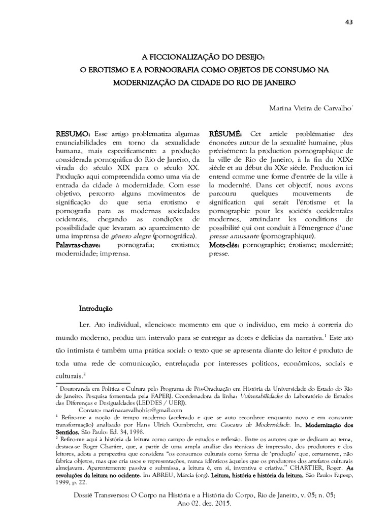 CARVALHO, Marina Vieira de. A ficcionalização do desejo: o erotismo e a pornografia como objetos de consumo na modernização da cidade do Rio de Janeiro. Revista Transversos. “Dossiê: O