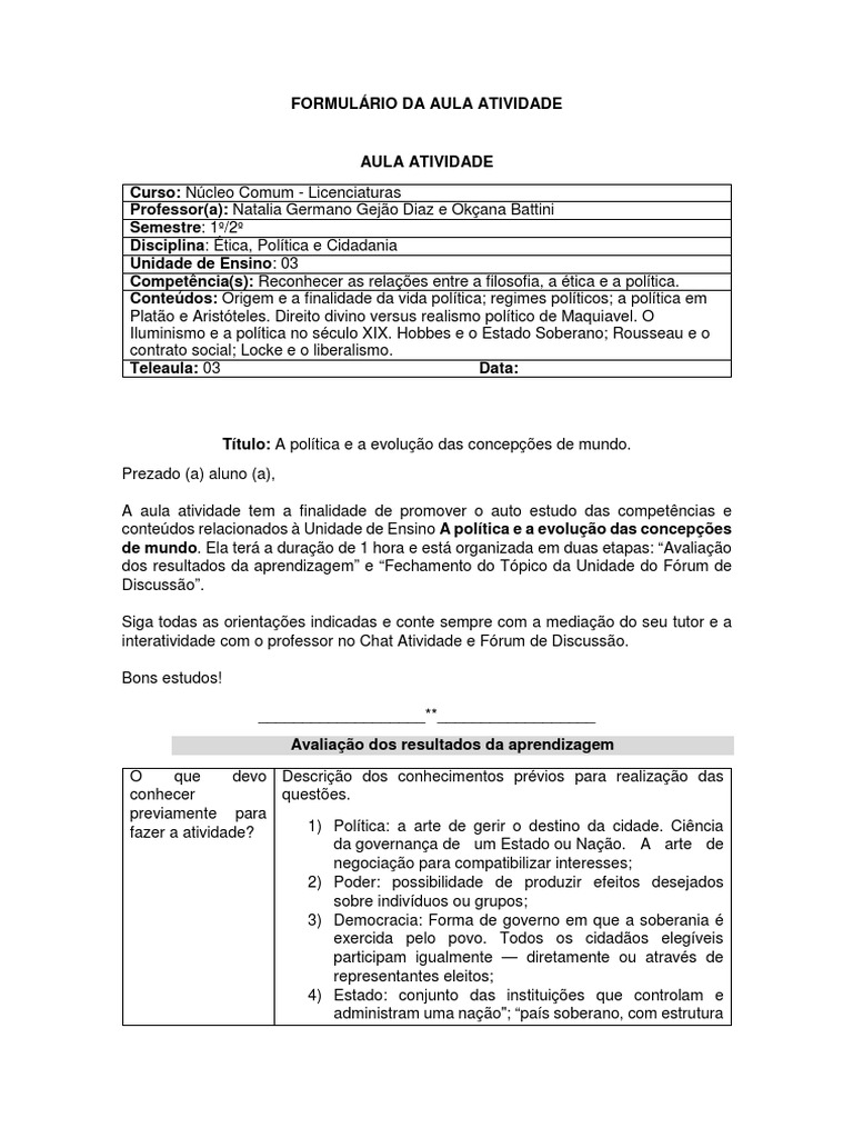 Contedos: Origem e a finalidade da vida poltica; regimes polticos; a poltica em