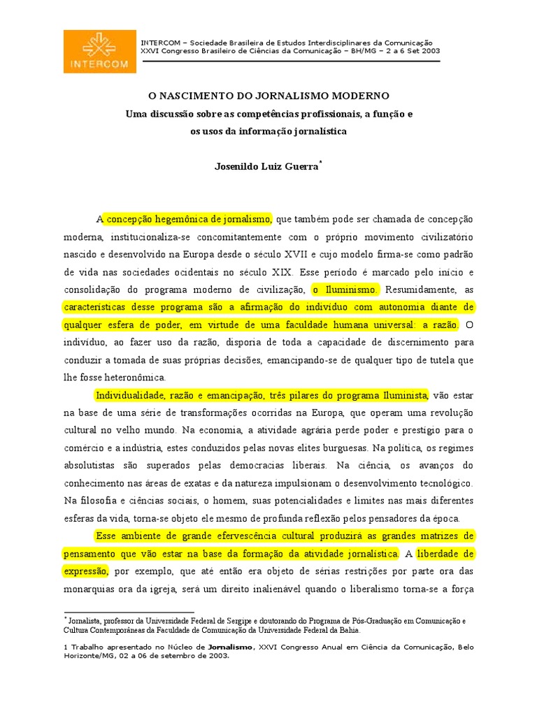 1 Trabalho apresentado no Ncleo de Jornalismo, XXVI Congresso Anual em Cincia da Comunicao, Belo