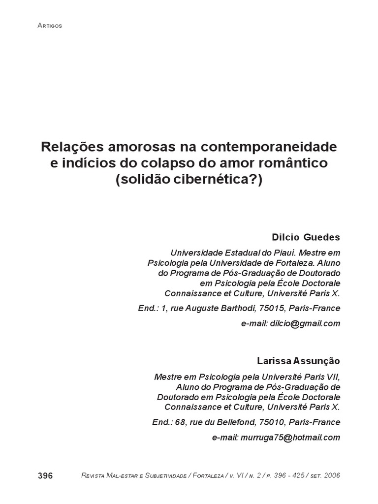 396 REVISTA MAL-ESTAR E SUBJETIVIDADE / FORTALEZA / V. VI / N. 2 / P. 396 - 425 / SET. 2006