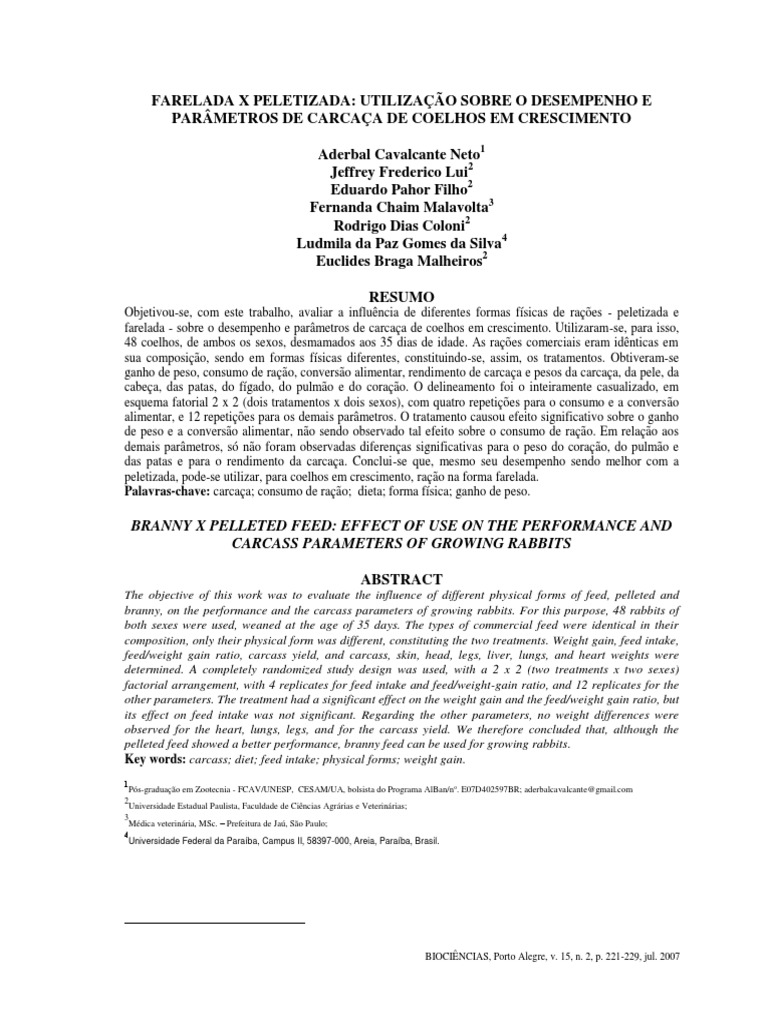 farelada - sobre o desempenho e parmetros de carcaa de coelhos em crescimento. Utilizaram-se, para isso,