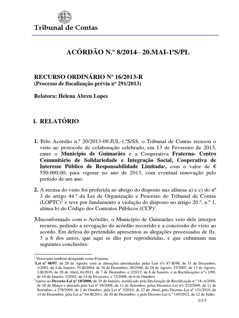 1. Pelo Acórdão n.º 20/2013-09.JUL-1.ªS/SS, o Tribunal de Contas recusou o visto ao protocolo de colaboração celebrado, em 13 de Fevereiro de 2013, entre o Município de Guimarães e a Cooperativa Fraterna- Centro Comunitário de Solidariedade e Integração Social, Cooperativa de Interesse Público de Responsabilidade Limitada 1 , com o valor de € 550.000,00, para vigorar no ano de 2013, com eventual renovação pelo período de um ano.