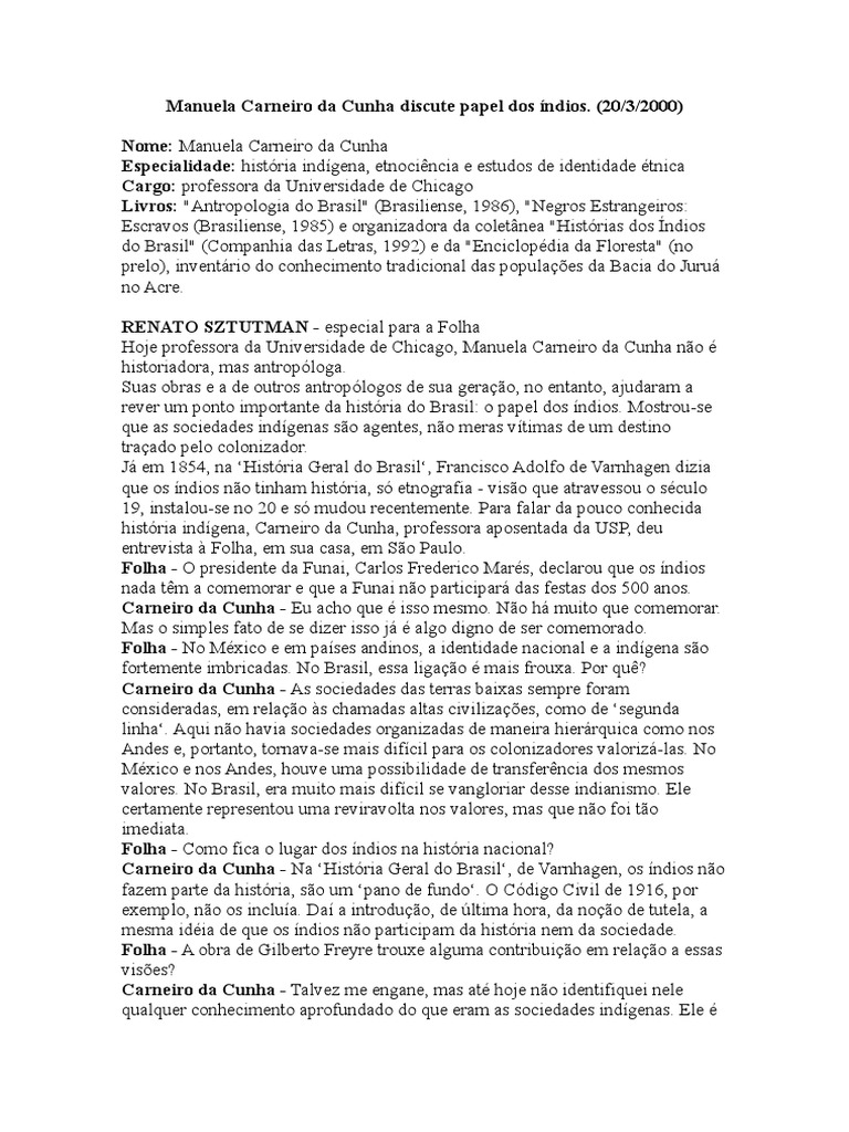 história indígena, Carneiro da Cunha, professora aposentada da USP, deu