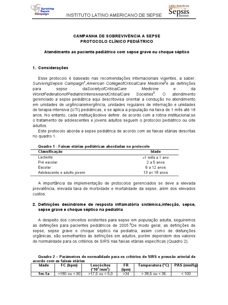 Esse protocolo é baseado nas recomendações internacionais vigentes, a saber, SurvivingSepsis Campaign 1 ,American CollegeofCriticalCare Medicine 2 e as definições para sepse daSocietyofCriticalCare Medicine e da WorldFederationofPediatricIntensiveandCriticalCare Societies 3 . O atendimento gerenciado a sepse pediátrica aqui descritovisa orientar a condução no atendimento em unidades de urgência/emergência, unidades regulares de internação e unidades de terapia intensiva (UTI) pediátricas, e se aplica a população na faixa de 1 mês até 18 anos. No entanto, cada instituiçãodeve definir, de acordo com a rotina institucional,se o tratamento de adolescentes e jovens adultos seguem o protocolo pediátrico ou ode adultos. Este protocolo aborda a sepse pediátrica de acordo com as faixas etárias descritas no quadro 1.