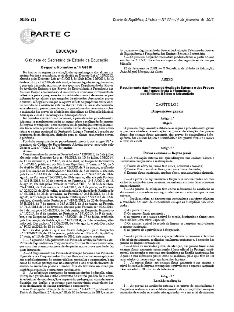 Despacho Normativo n.º 4-A/2018 12 de fevereiro de 2018. — O Secretário de Estado da Educação,