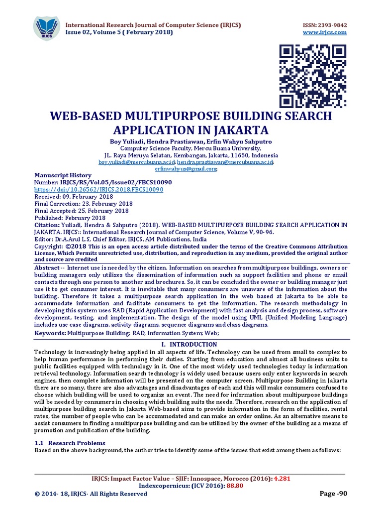 Received: 09, February 2018 Final Correction: 23, February 2018 Final Accepted: 25, February 2018 Published: February 2018 Citation: Yuliadi, Hendra & Sahputro (2018). WEB-BASED MULTIPURPOSE BUILDING SEARCH APPLICATION IN JAKARTA. IRJCS:: International Research Journal of Computer Science, Volume V, 90-96. Editor: Dr.A.Arul L.S, Chief Editor, IRJCS, AM Publications, India