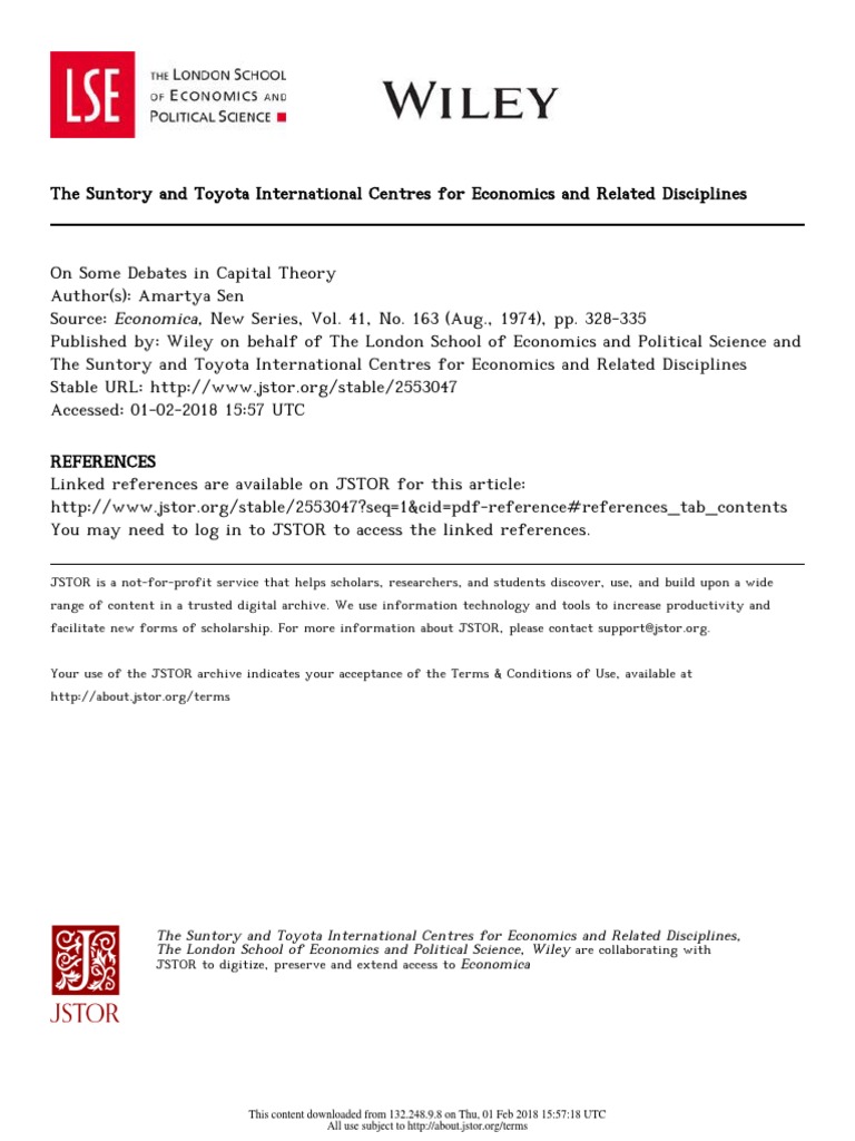 On Some Debates in Capital Theory Author(s): Amartya Sen Source: Economica, New Series, Vol. 41, No. 163 (Aug., 1974), pp. 328-335 Published by: Wiley on behalf of The London School of Economics and Political Science and The Suntory and Toyota International Centres for Economics and Related Disciplines Stable URL: http://www.jstor.org/stable/2553047 Accessed: 01-02-2018 15:57 UTC
