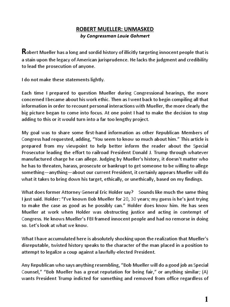 My goal was to share some first-hand information as other Republican Members of Congress had requested, adding, “You seem to know so much about him.” This article is prepared from my viewpoint to help better inform the reader about the Special Prosecutor leading the effort to railroad President Donald J. Trump through whatever manufactured charge he can allege. Judging by Mueller's history, it doesn't matter who he has to threaten, harass, prosecute or bankrupt to get someone to be willing to allege something—anything—about our current President, it certainly appears Mueller will do what it takes to bring down his target, ethically, or unethically, based on my findings.