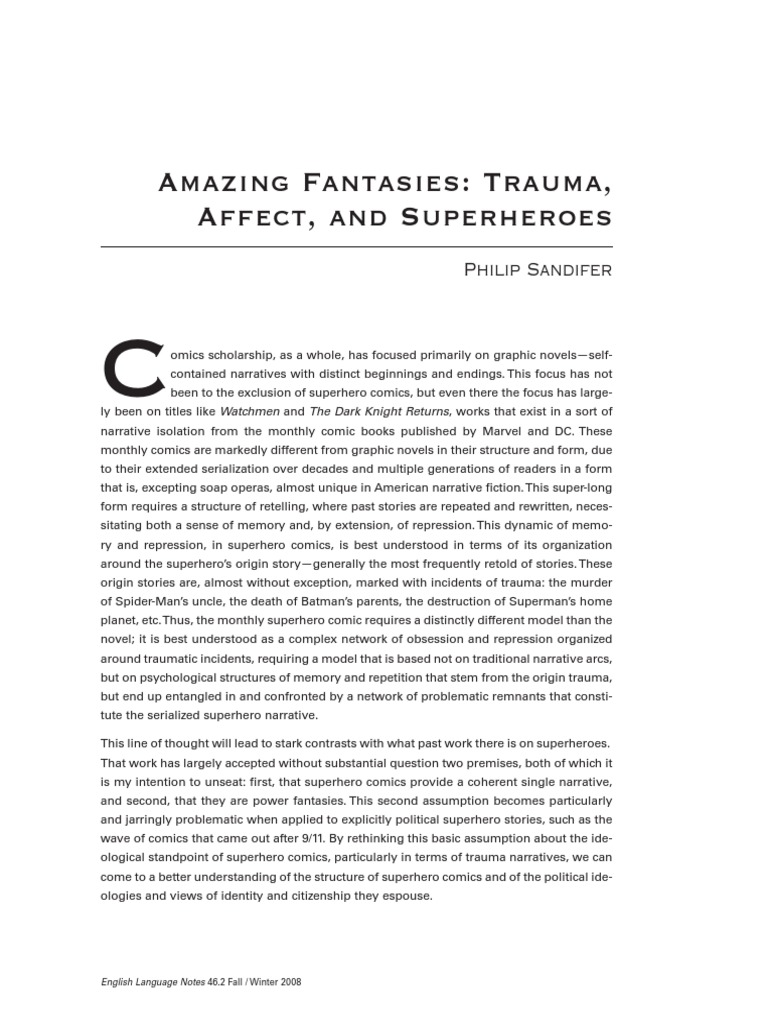 ological standpoint of superhero comics, particularly in terms of trauma narratives, we can