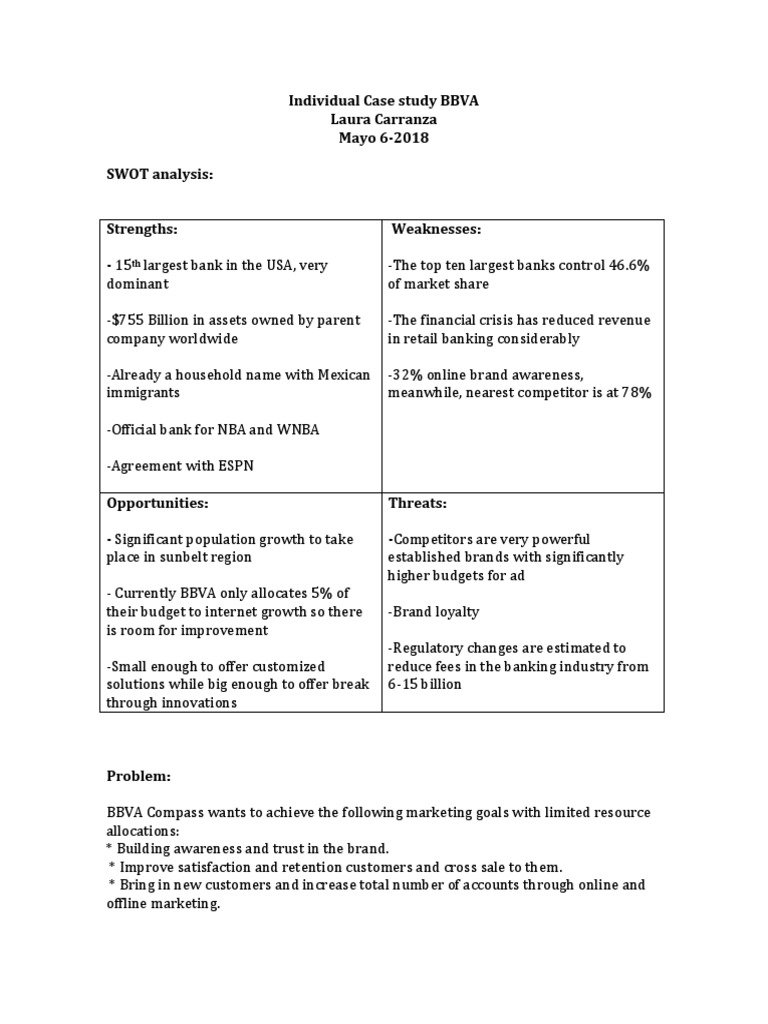 BBVA Compass wants to achieve the following marketing goals with limited resource