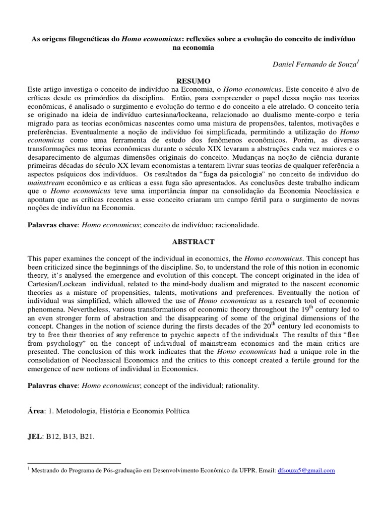 Este artigo investiga o conceito de indivíduo na Economia, o Homo economicus. Este conceito é alvo de