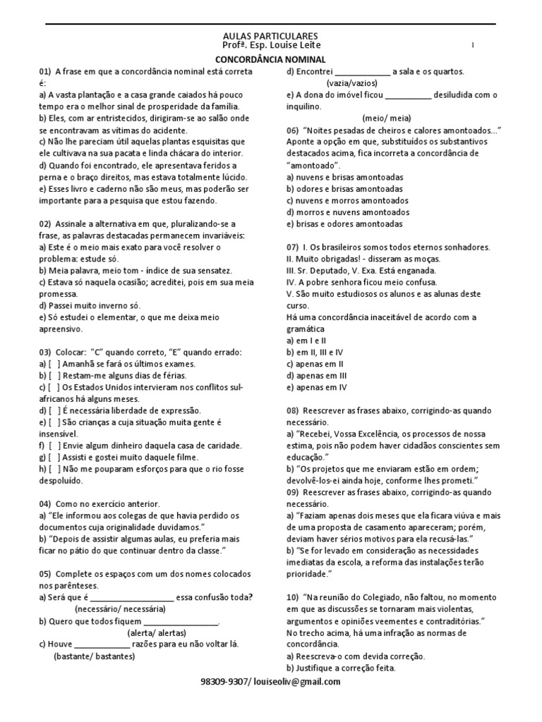 01) A frase em que a concordância nominal está correta d) Encontrei ____________ a sala e os quartos.