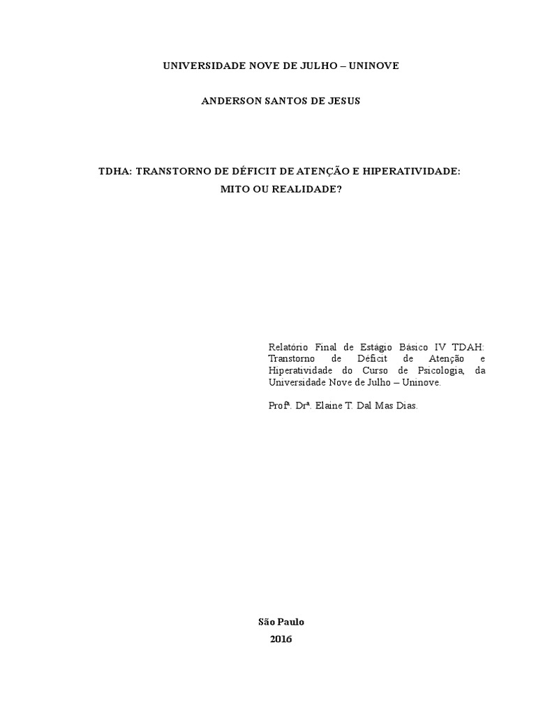Este relatório tem como tema discutido TDAH: Transtorno de Déficit de