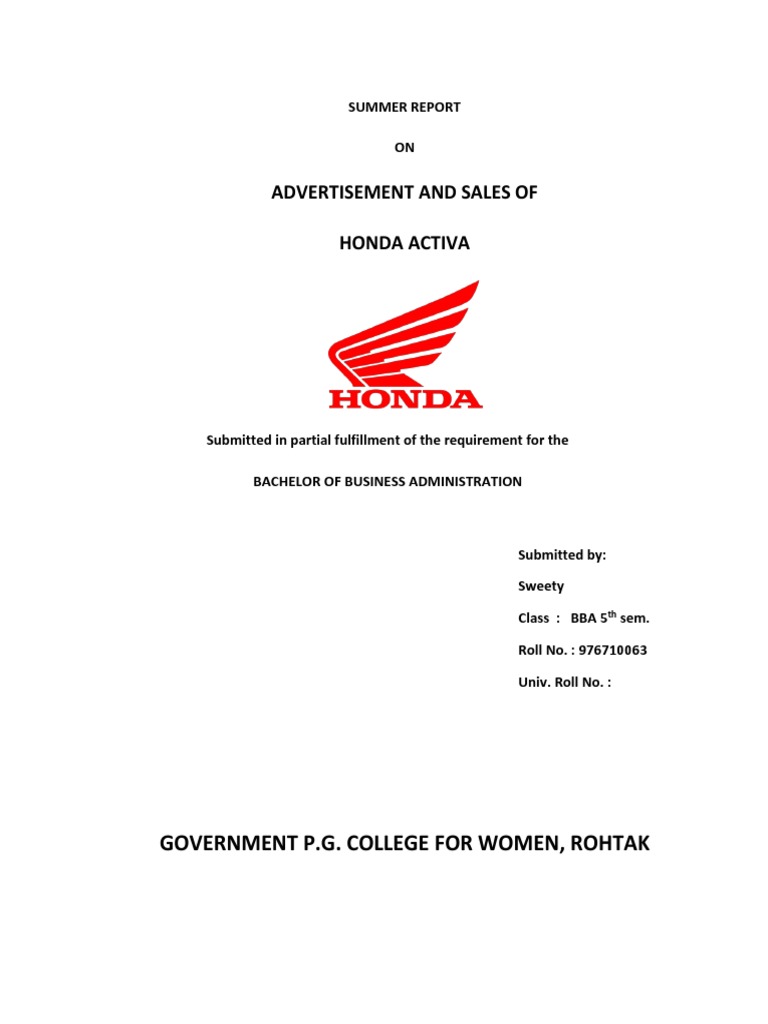 Increase the Sales of HONDA ACTIVA”is a original piece of work done by me and has been not submitted