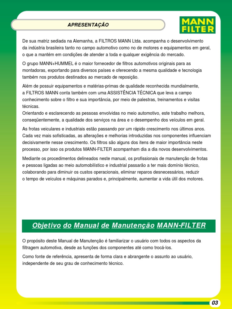 O propósito deste Manual de Manutenção é familiarizar o usuário com todos os aspectos da filtragem automotiva, desde as funções dos componentes até como trocá-los.