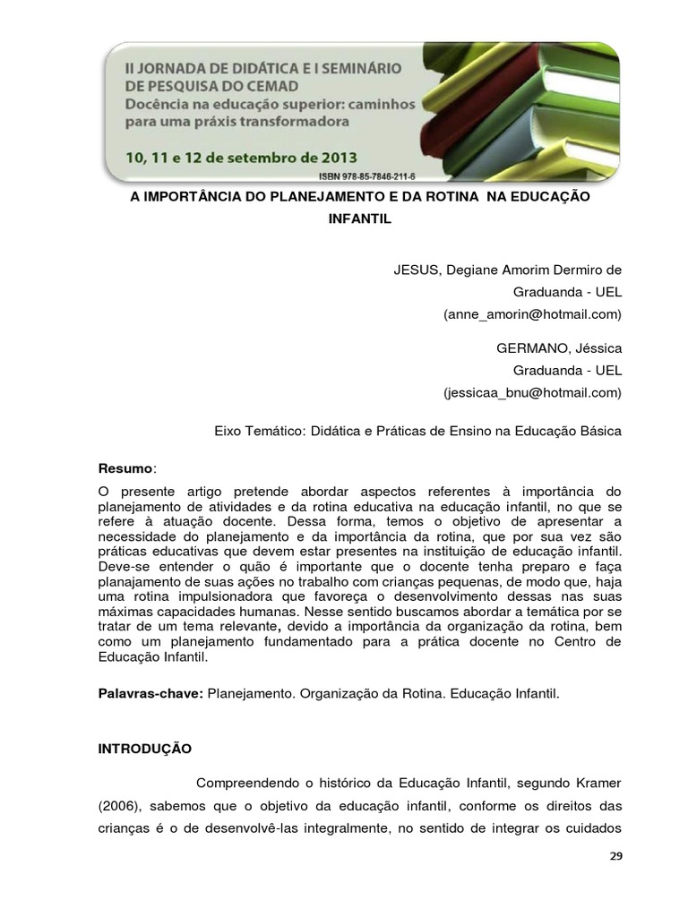 Palavras-chave: Planejamento. Organização da Rotina. Educação Infantil.