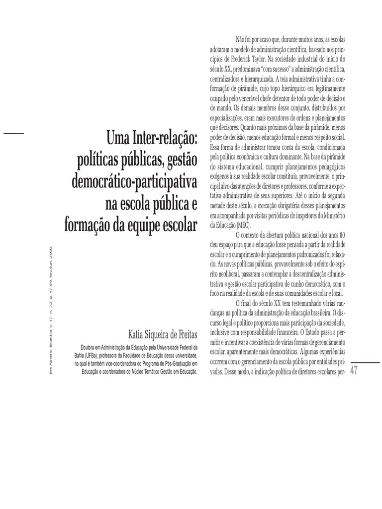 A sociedade admite a importância da escola na prepara- Durante toda a década de 80, o ideal de gestão demo-