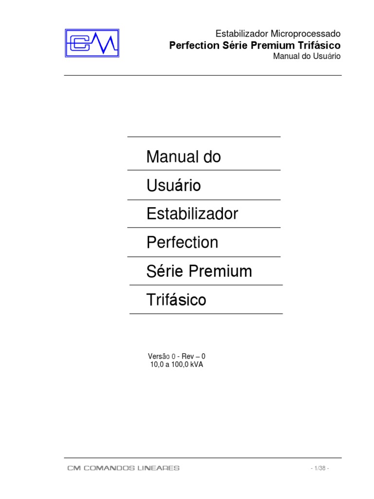 Este manual contÈm instruÁıes referentes ao recebimento, manuseio, armazenagem, instalaÁ„o, posicionamento, ativaÁ„o inicial e operaÁ„o do Estabilizador Perfection SÈrie Premium. Leia este manual cuidadosamente antes de efetuar os procedimentos de instalaÁ„o, que deve ser feito por pessoal capacitado.