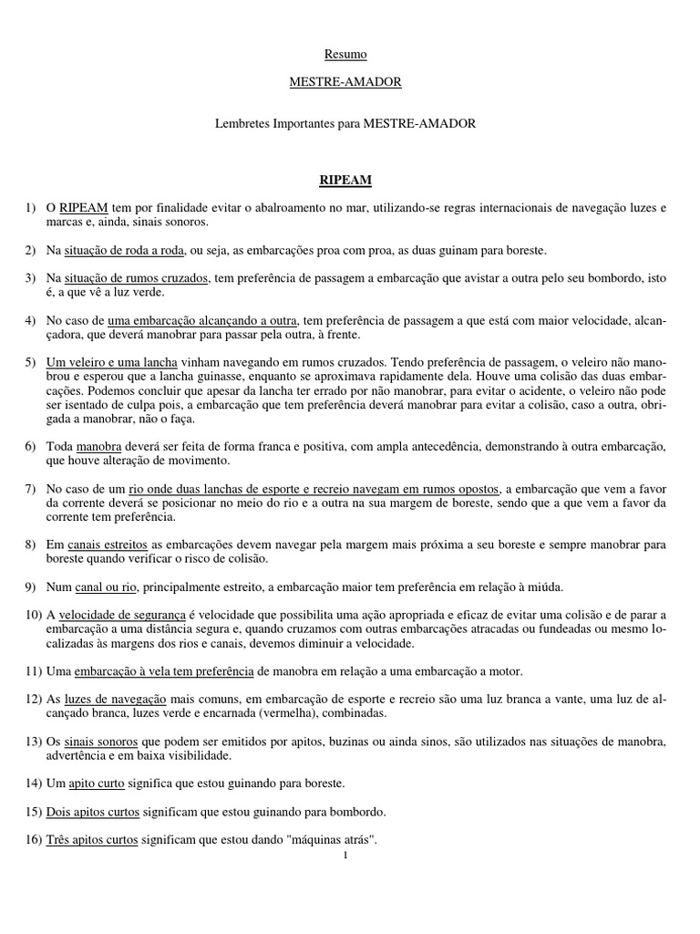 1) O RIPEAM tem por finalidade evitar o abalroamento no mar, utilizando-se regras internacionais de navegação luzes e
