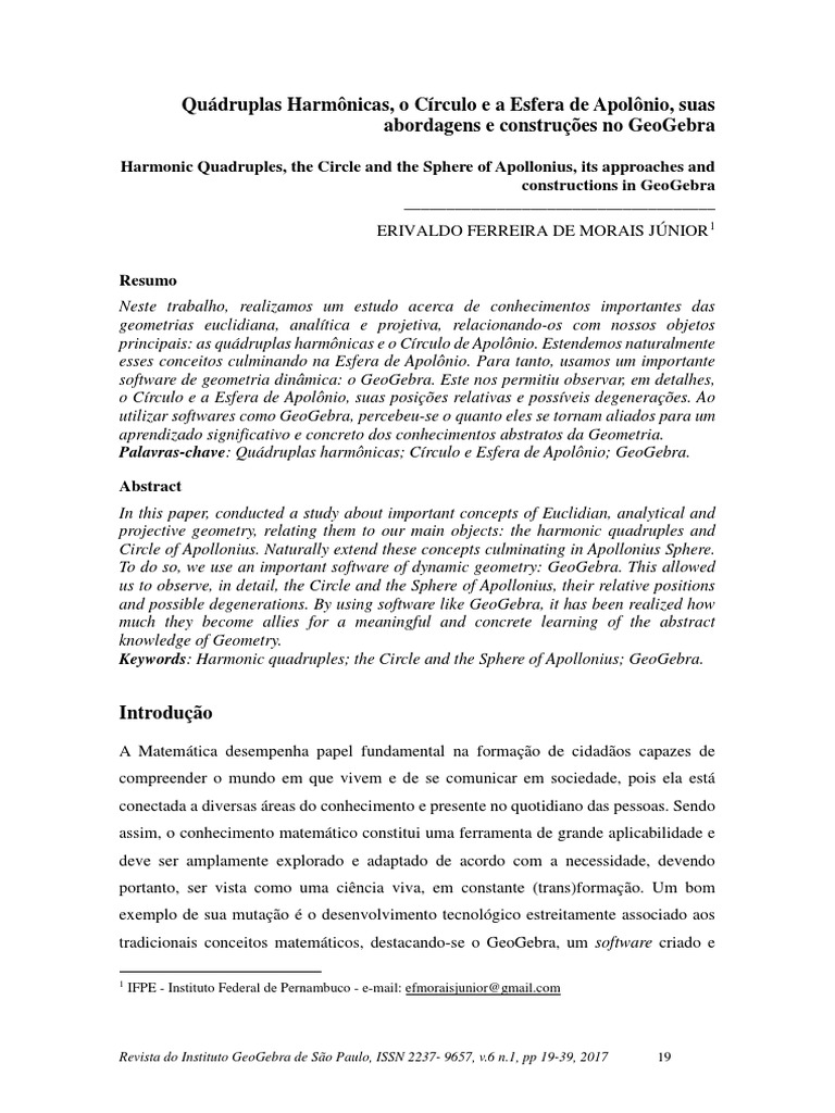 Palavras-chave: Quádruplas harmônicas; Círculo e Esfera de Apolônio; GeoGebra.