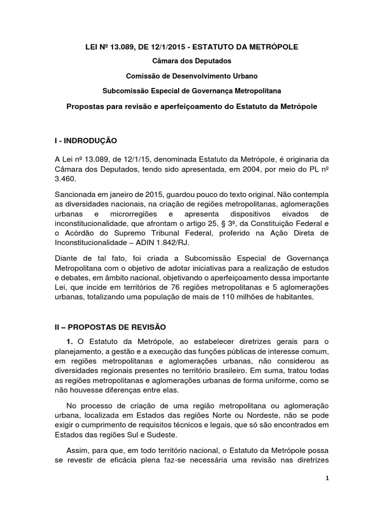 Propostas para revisão e aperfeiçoamento do Estatuto da Metrópole