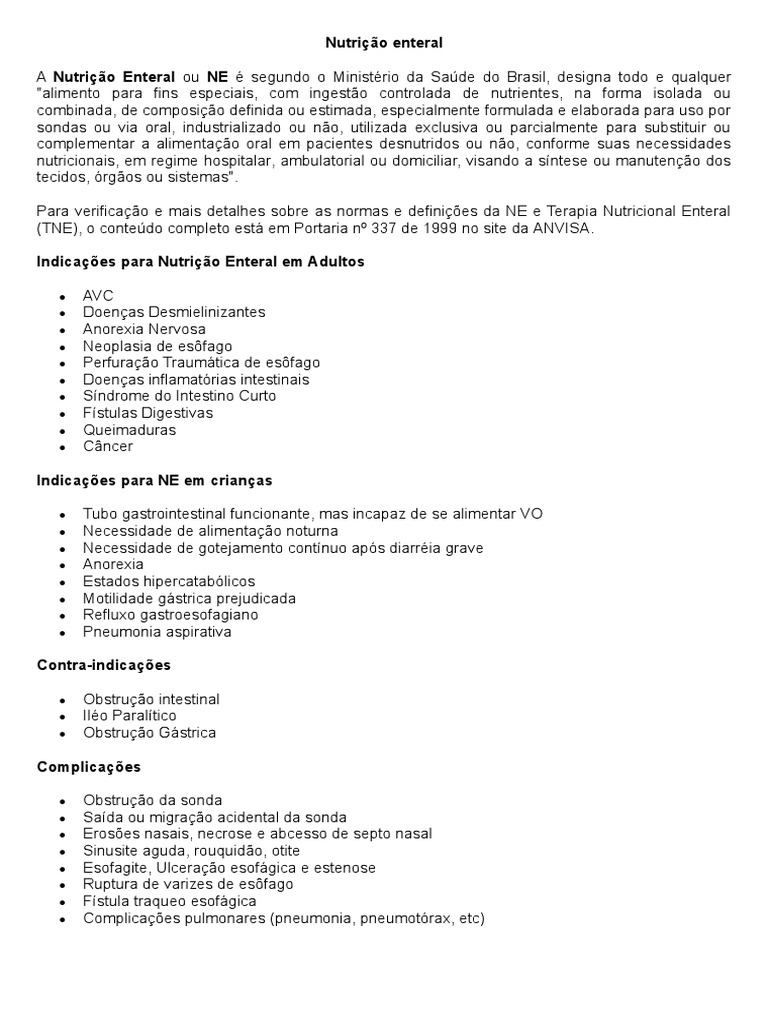 Para verificação e mais detalhes sobre as normas e definições da NE e Terapia Nutricional Enteral