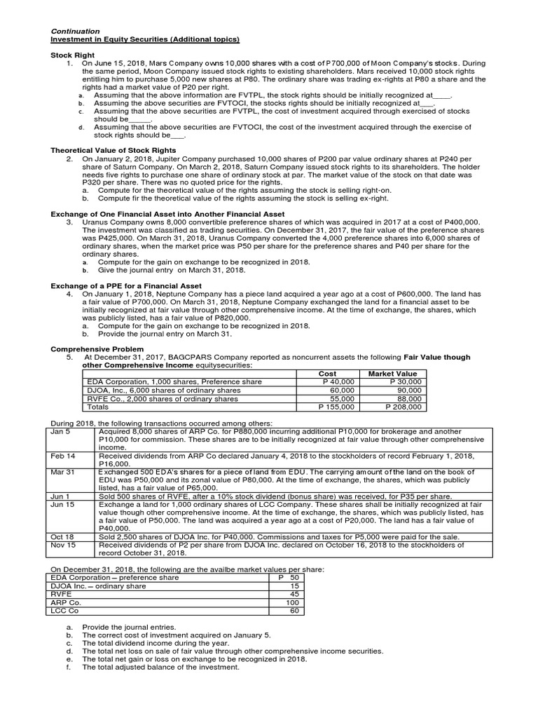 1. On June 15, 2018, Mars Company owns 10,000 shares with a cost of P700,000 of Moon Company’s stocks. During