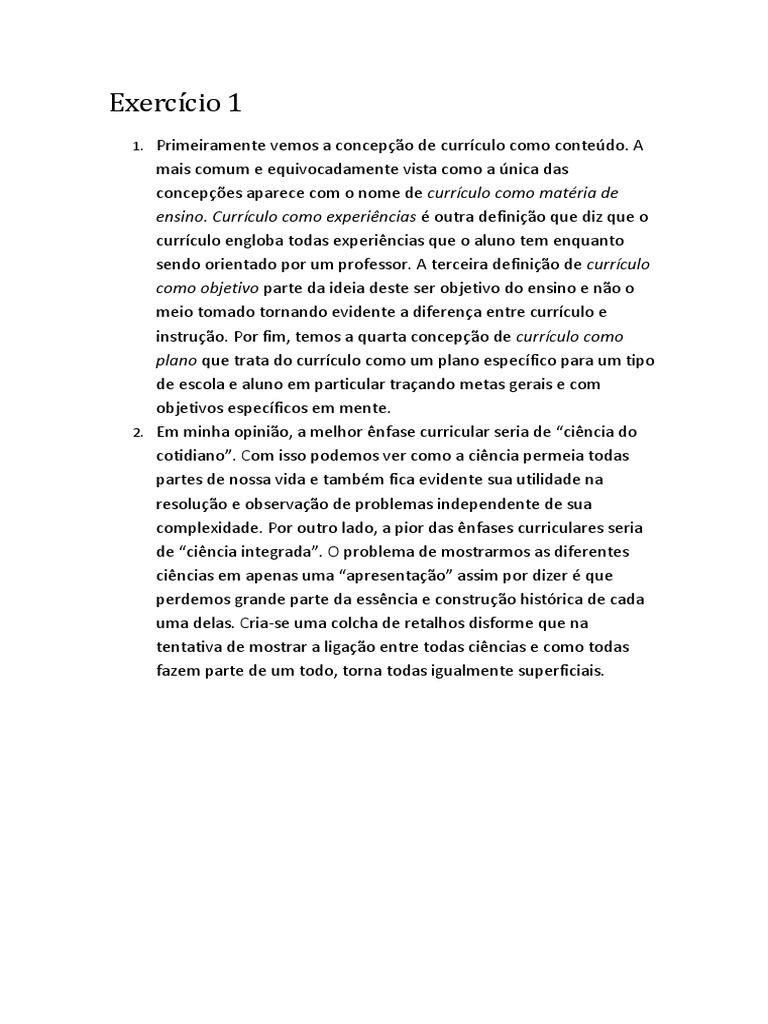 1. Primeiramente vemos a concepção de currículo como conteúdo. A mais comum e equivocadamente vista como a única das concepções aparece com o nome de currículo como matéria de ensino. Currículo como experiências é outra definição que diz que o currículo engloba todas experiências que o aluno tem enquanto sendo orientado por um professor. A terceira definição de currículo como objetivo parte da ideia deste ser objetivo do ensino e não o meio tomado tornando evidente a diferença entre currículo e instrução. Por fim, temos a quarta concepção de currículo como plano que trata do currículo como um plano específico para um tipo de escola e aluno em particular traçando metas gerais e com objetivos específicos em mente.