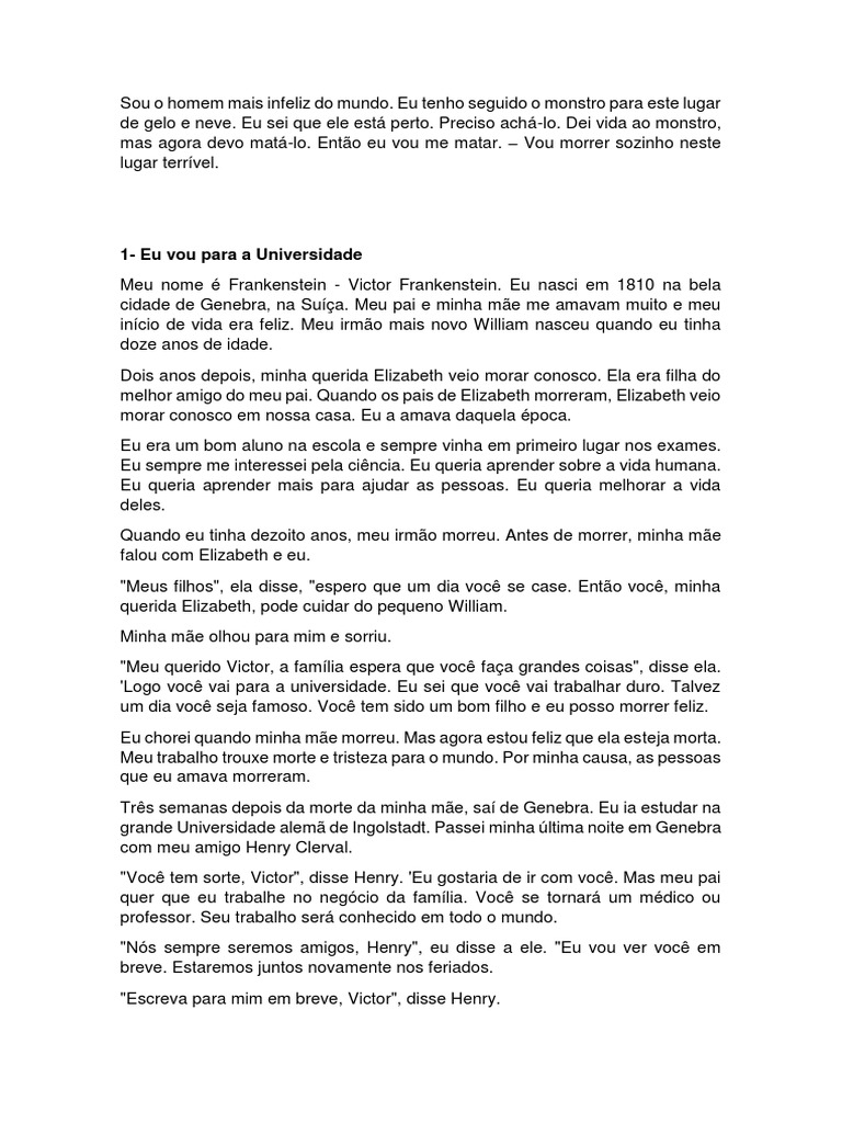 Eu, Victor Frankenstein, doutor de Genebra, digo estas palavras. Vou passar o