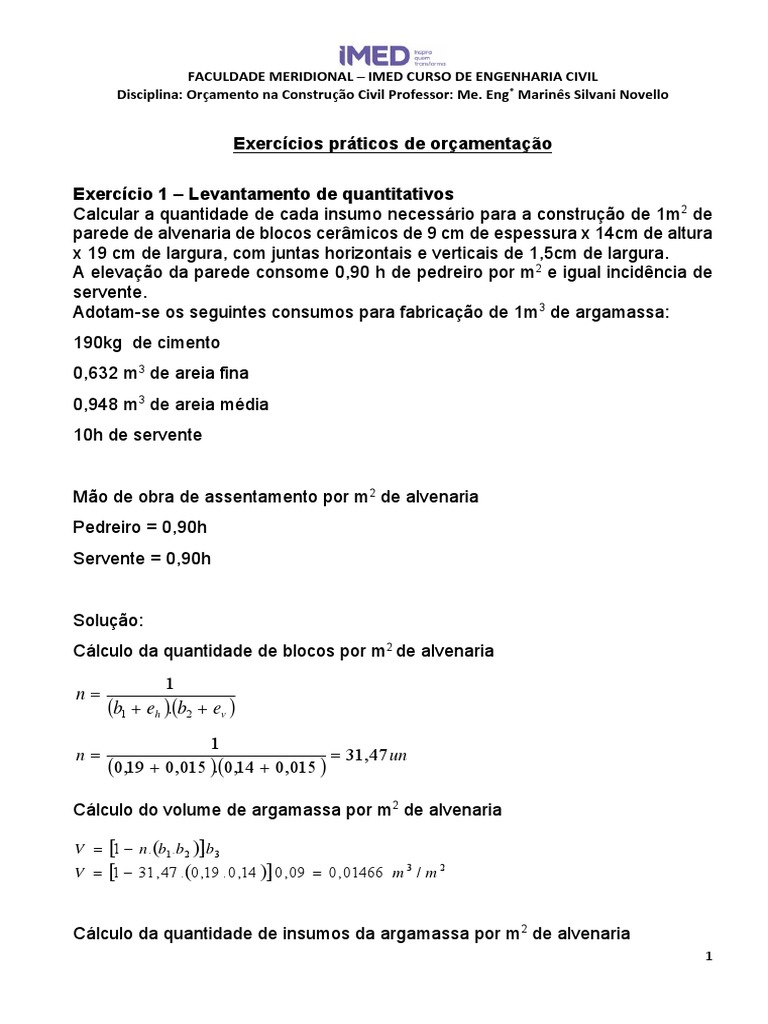 Cálculo do volume de argamassa por m2 de alvenaria