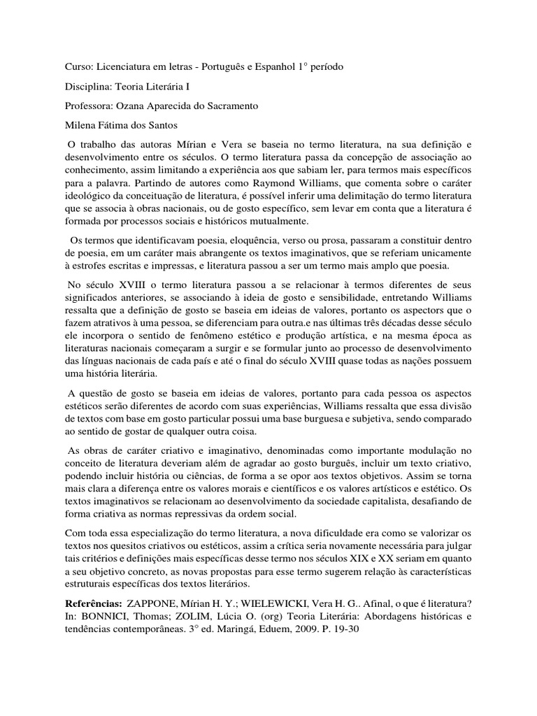 Referências: ZAPPONE, Mírian H. Y.; WIELEWICKI, Vera H. G.. Afinal, o que é literatura?