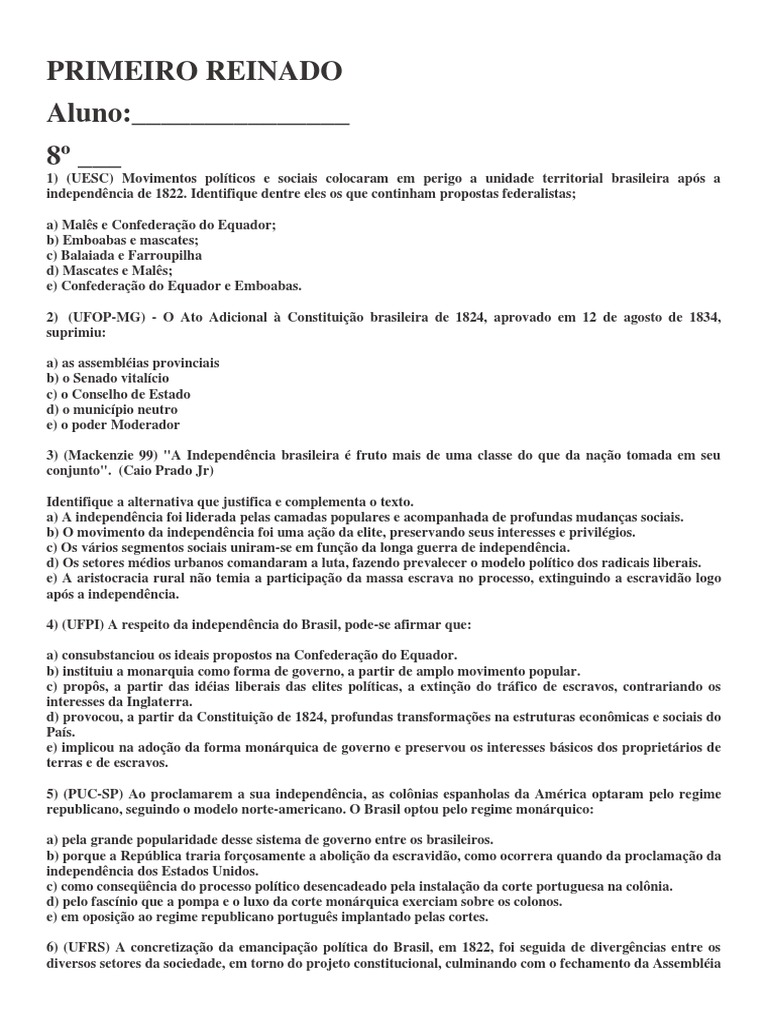 6) (UFRS) A concretização da emancipação política do Brasil, em 1822, foi seguida de divergências entre os