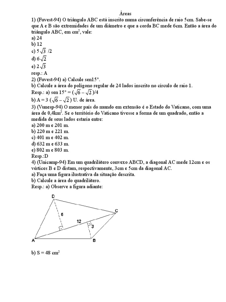 4) (Unicamp-94) Em um quadrilátero convexo ABCD, a diagonal AC mede 12cm e os