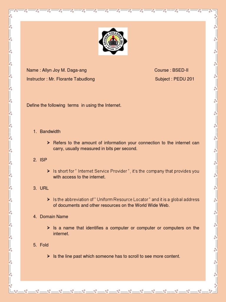 Define the following terms in using the Internet.