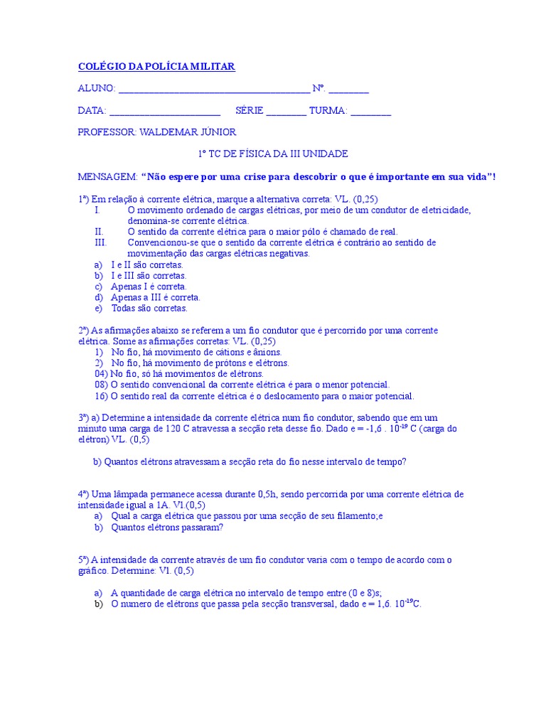 1ª) A corrente elétrica em um condutor metálico se deve ao movimento de: VL. (0,25)