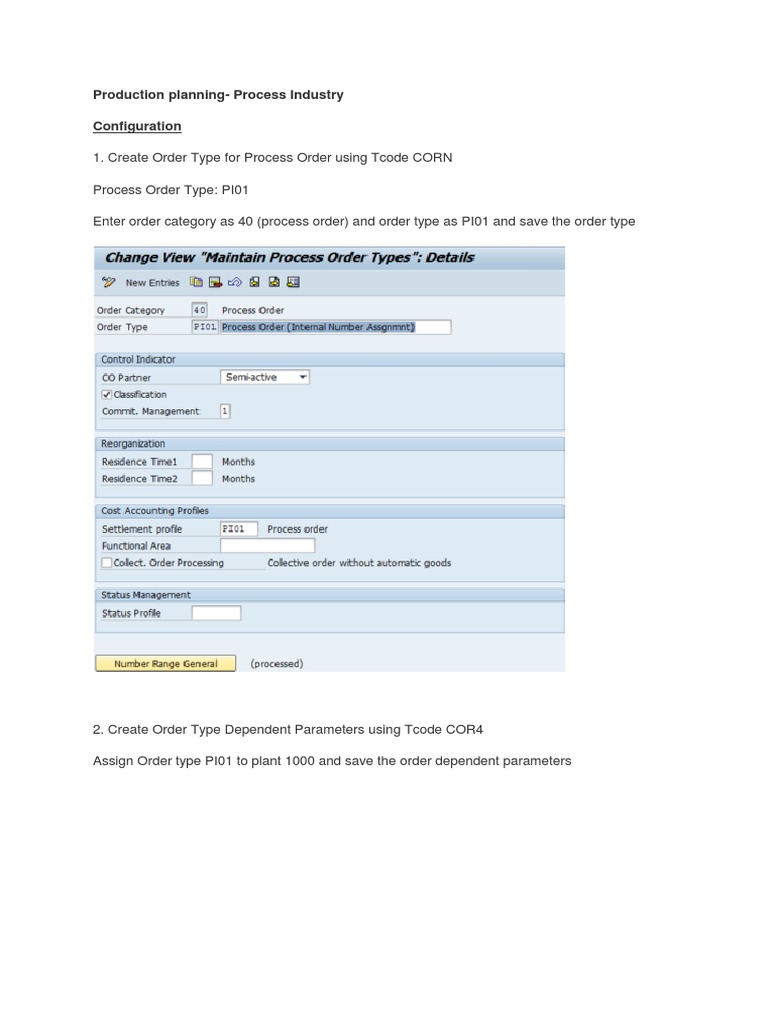 Assign Order type PI01 to plant 1000 and save the order dependent parameters