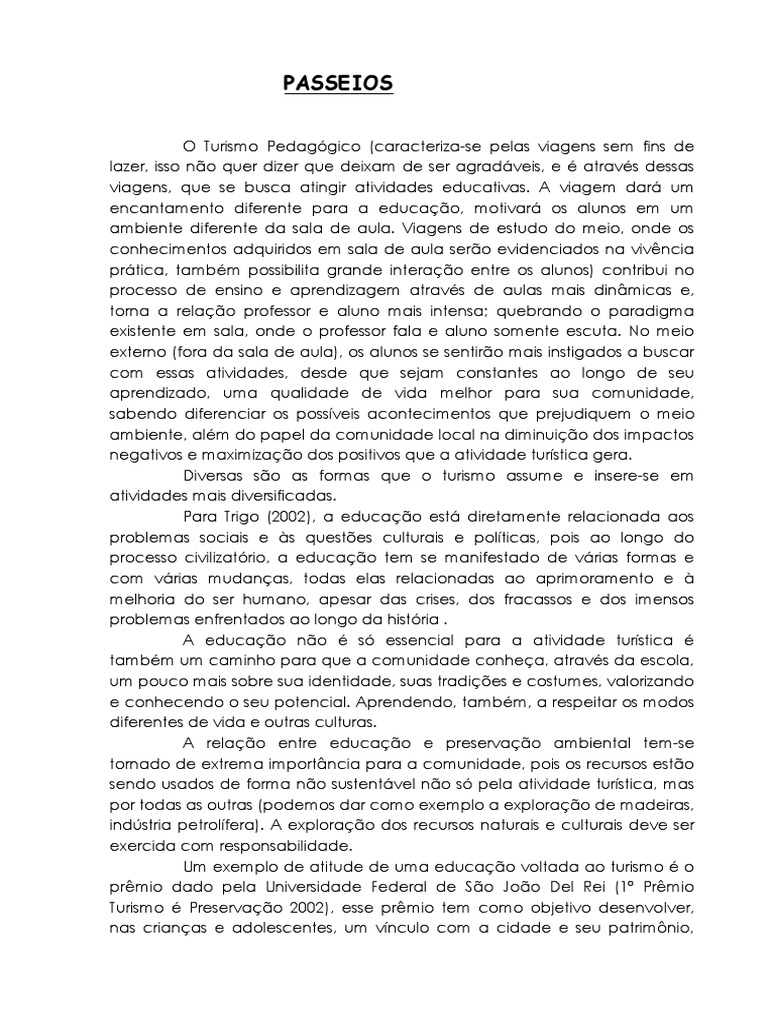 lazer, isso não quer dizer que deixam de ser agradáveis, e é através dessas viagens, que se busca atingir atividades educativas. A viagem dará um encantamento diferente para a educação, motivará os alunos em um ambiente diferente da sala de aula. Viagens de estudo do meio, onde os conhecimentos adquiridos em sala de aula serão evidenciados na vivência prática, também possibilita grande interação entre os alunos) contribui no processo de ensino e aprendizagem através de aulas mais dinâmicas e, torna a relação professor e aluno mais intensa; quebrando o paradigma existente em sala, onde o professor fala e aluno somente escuta. No meio externo (fora da sala de aula), os alunos se sentirão mais instigados a buscar com essas atividades, desde que sejam constantes ao longo de seu aprendizado, uma qualidade de vida melhor para sua comunidade, sabendo diferenciar os possíveis acontecimentos que prejudiquem o meio ambiente, além do papel da comunidade local na diminuição dos impactos negativos e maximização dos positivos que a atividade turística gera. Diversas são as formas que o turismo assume e insere-se em atividades mais diversificadas. Para Trigo (2002), a educação está diretamente relacionada aos problemas sociais e às questões culturais e políticas, pois ao longo do processo civilizatório, a educação tem se manifestado de várias formas e com várias mudanças, todas elas relacionadas ao aprimoramento e à melhoria do ser humano, apesar das crises, dos fracassos e dos imensos problemas enfrentados ao longo da história . A educação não é só essencial para a atividade turística é também um caminho para que a comunidade conheça, através da escola, um pouco mais sobre sua identidade, suas tradições e costumes, valorizando e conhecendo o seu potencial. Aprendendo, também, a respeitar os modos diferentes de vida e outras culturas. A relação entre educação e preservação ambiental tem-se tornado de extrema importância para a comunidade, pois os recursos estão sendo usados de forma não sustentável não só pela atividade turística, mas por todas as outras (podemos dar como exemplo a exploração de madeiras, indústria petrolífera). A exploração dos recursos naturais e culturais deve ser exercida com responsabilidade. Um exemplo de atitude de uma educação voltada ao turismo é o prêmio dado pela Universidade Federal de São João Del Rei (1º Prêmio Turismo é Preservação 2002), esse prêmio tem como objetivo desenvolver, nas crianças e adolescentes, um vínculo com a cidade e seu patrimônio, através de trabalhos que levem à reflexão sobre a importância da preservação e do planejamento para a exposição do turismo. A Educação Ambiental deve envolver toda a comunidade, mas a consciência para a conservação da natureza deve ser iniciada através da escola. Torna-se imprescindível mostrar aos educandos os problemas existentes hoje: degradação dos recursos naturais, da escassez da água, poluição do ar, efeito estufa, desmatamento, erosão, extinção de espécies animais, deve-se envolver esses alunos no reconhecimento dos bens e recursos que seu município oferece, atentá-los da importância pela busca da melhoria da qualidade do ambiente e da vida humana, que satisfaçam estas e as futuras gerações é de suma relevância. Segundo Mata (1999), a faixa etária de 0 a 6 anos tem características e necessidades diferenciadas das outras, que requerem cuidado e atenção por parte do adulto e que, quando negligenciadas, colocam em risco a sobrevivência da própria criança, ou comprometem gravemente seu desenvolvimento posterior. Assim, as crianças dessa idade são mais sensíveis, e se despertadas, darão vida à criatividade infantil. A elaboração de conceitos pela criança irá depender da diversidade, não só quantitativa, mas, especialmente, qualitativa, das experiências interacionais que vivenciará nos espaços institucionais nos quais se encontrar. Assim, tanto os educadores como as instituições são os grandes responsáveis pela formação de grande parte dos conceitos e atitudes que as crianças possam ter, através da interação harmônica entre as crianças; do despertar de interesses dos alunos; da participação ativa nas aulas aplicadas, utilizando métodos pedagógicos, muitas vezes, lúdicos ou de visitação (exemplo: aulas passeio). Todo método de aprendizagem utilizado deve ser estruturado e analisado como sendo o apropriado à criança, pois ao analisar os métodos tradicionais de estudo da formação de conceitos na infância, Vygotski (1989), não acredita que a criança é um adulto em miniatura ou como um ser que evolui acumulando e reproduzindo conhecimentos. Afirma que as condições de compreensão e comunicação são partilhadas, desde o nascimento, por adultos e crianças e que, por sua vez, as formas de funcionamento do pensamento infantil diferem da do adulto em sua composição, estrutura e modo de operação . Essas informações adquiridas devem ser transformadas em conhecimento. Para isso, é essencial o turismo como ferramenta pedagógica. As atividades realizadas nesse segmento turístico voltado à educação devem ser as saídas a campo e aula-passeio, nas quais as crianças terão contato com o meio, colocando em prática os ensinamentos obtidos em sala de aula. Além do respeito a sua cultura e ao patrimônio, a educação deve desenvolver o potencial do aluno, valorizando a criatividade e a capacidade de resolver problemas, investir na sua capacidade de comunicação e inovação, com propostas e ações para melhorar o ambiente e a qualidade de vida do seu município. Essas ações irão servir para estabelecer uma relação do aluno com o meio. Segundo Bacal (2003) há dois tipos de conhecimentos existentes e que também envolvem a atividade turística, o conhecimento de e o conhecimento acerca de. O primeiro é o conhecimento resultante da investigação cien