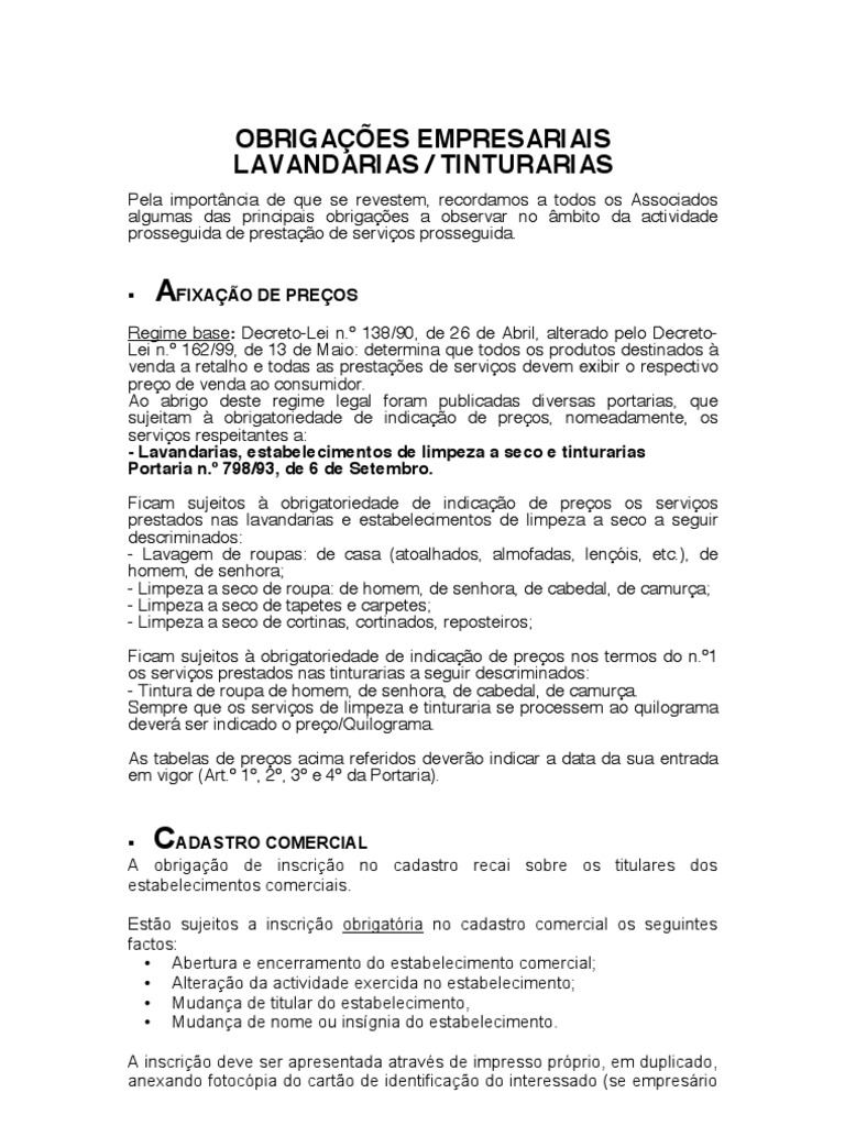OBRIGAÇÕES EMPRESARIAIS LAVANDARIAS / TINTURARIAS