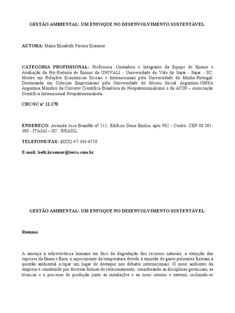 ambiental da empresa; desenvolvimento sustentável; gestão ambiental; impacto ambiental; benefícios